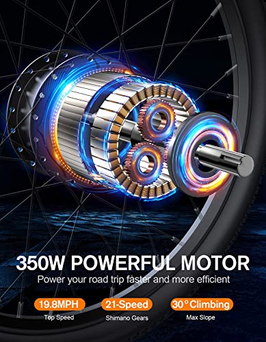 - POWERFUL 350W MOTOR & WHEELS: This 26'' electric bike is equipped with powerful 350W motor, helping riders reach a top speed of 19.8mph. The riding range is 28-30 miles in pure electric bike mode and 50-60miles in pure assisted bike mode. It is very suitable for daily commuting and exercising. Strong wheels and motor allow you to face all kinds of terrain with ease. You don't have to worry about the traffic jams, which makes your commuting much easier.